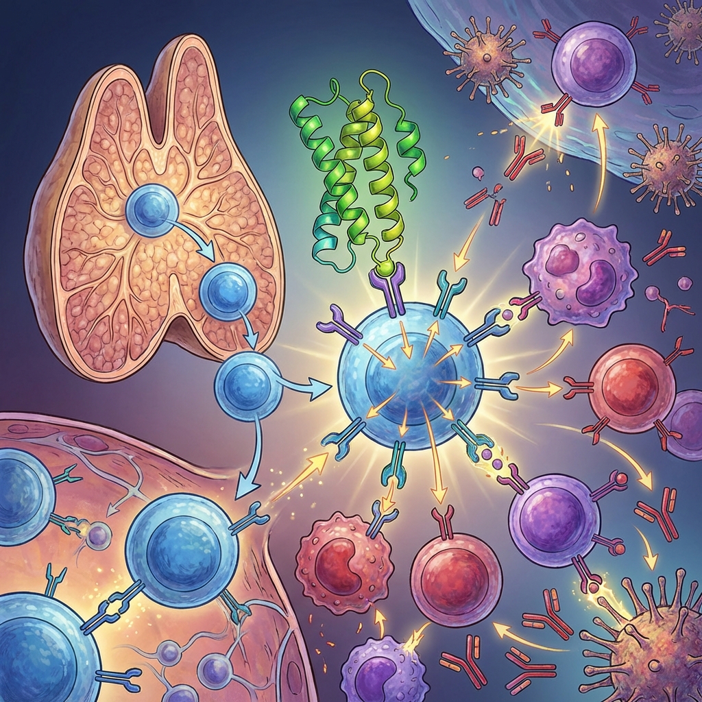 Within the research community, certain peptides are being studied for their potential role in immune modulation and cellular resilience relevant to chronic viral conditions. Thymosin Alpha-1 (TA1) is among the most researched in this context, with studies suggesting it may enhance T-cell activity and natural killer (NK) cell function โ both critical arms of antiviral immunity. BPC-157 is being investigated for its systemic anti-inflammatory properties and its potential role in gut barrier integrity, which has downstream effects on immune regulation. These are areas of active research, and applications in the context of EBV management represent an emerging frontier.