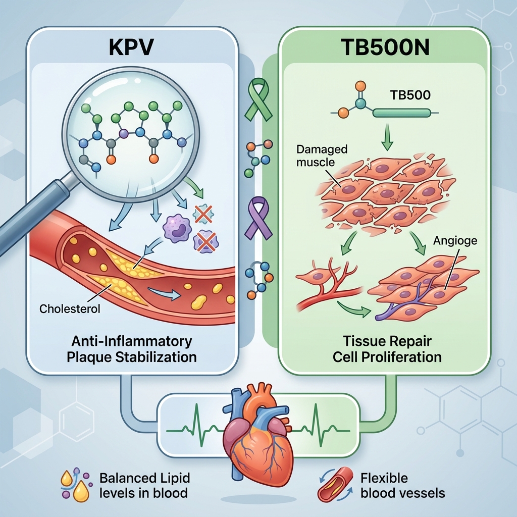 TB-500 (Thymosin Beta-4 fragment) is a synthetic peptide known for its roles in tissue repair, cellular migration, and โ critically โ angiogenesis and endothelial regeneration. Research into TB-500 points to its potential to support the healing of damaged vascular tissue, reduce cardiac fibrosis, and improve functional recovery following ischemic events. Its anti-inflammatory profile complements KPV's NF-kB suppression, potentially creating a synergistic effect on vascular health at both the preventive and restorative levels.
