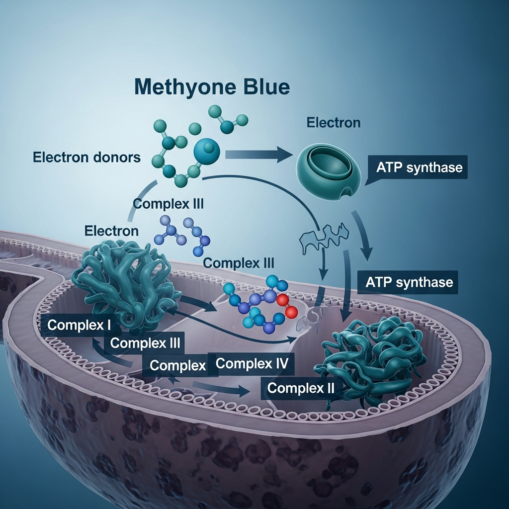 Methylene blue is one of the oldest synthetic compounds known to medicine, and its mechanism of action is both elegant and profound. Unlike stimulants that force the brain to deplete ATP reserves, methylene blue actually increases ATP production by acting as an alternative electron carrier in the mitochondrial electron transport chain.